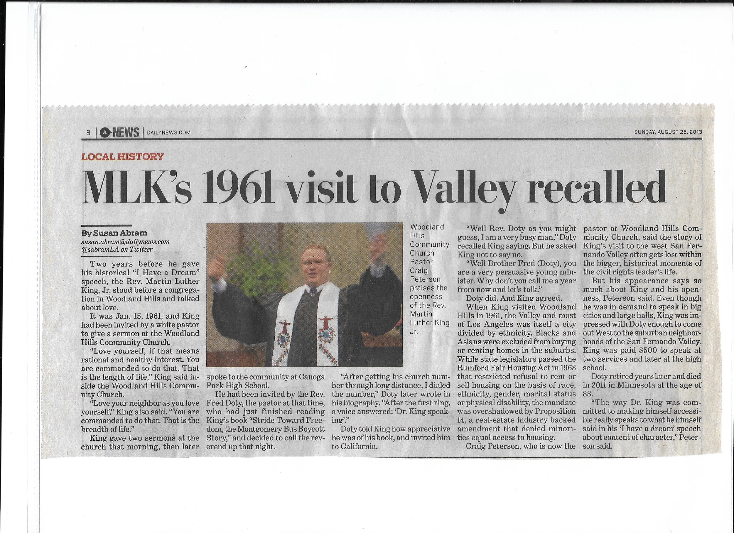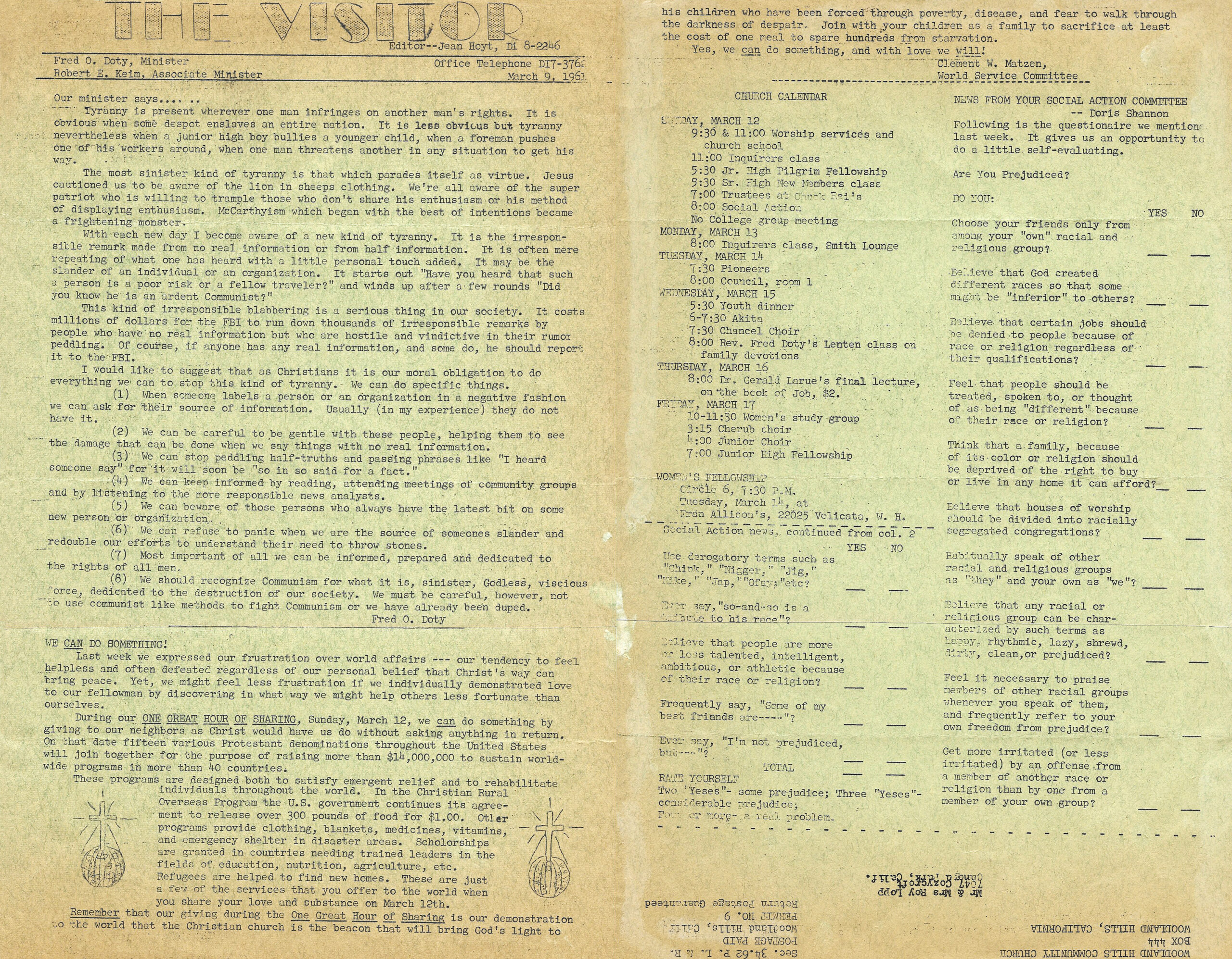 During Rev. Doty’s pastorate many famous speakers spoke at our church: Dr. Martin Luther King, Andrew Young, John Wooden, Louie Lomax, Lillian Smith, Maurice Dawkins, Dr. Paul Brand, Dr. John Peters, Dr. Frank Laubach, Milliard Fuller, Dr. Alan Hunter, Dr. Roy Burkhart, and Robert E. Lee.