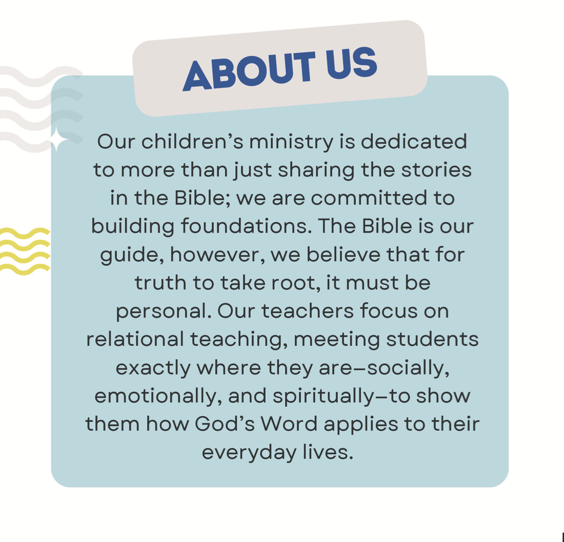 Children of all ages are welcome to join Sunday School each week. Starting in the Sanctuary at 10am they join ‘Children’s Time’ with the congregation and then are led to their Sunday School rooms by our teachers. At the end of service the kids are brought back into the Sanctuary to join in the closing circle and song.