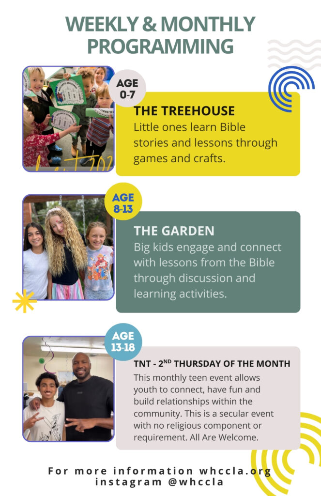 Woodland Hills Community Church (WHCCLA) welcomes children of all ages to Sunday School each week during the worship service at 10:00am, lead by Marshelle Giggles-Mills, our Children and Youth Ministries Director.