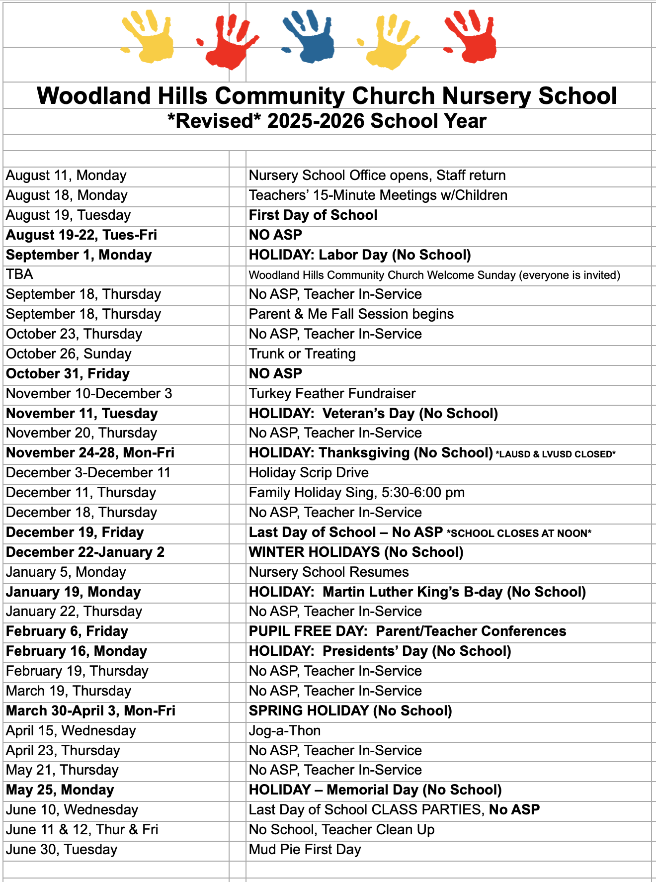 Nursery School Calendar